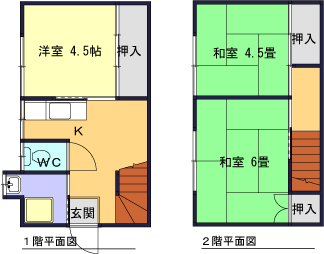 | 備考 |   1階:洋室4.5帖 キッチン 2階:和室4.5畳 和室6畳 2口ガスコンロ設置可能 ※2033年2月末までの契約となります ※駐車場空き要確認 ■退去時、ハウスクリーニング費用負担有り ■現況優先(設備等現況を優先いたします)  |