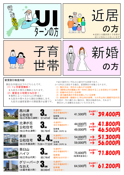 | 備考 | ★島根県住宅供給公社が運営する「公社賃貸住宅」です。礼金・仲介手数料・更新手数料は、もちろん0円!また、公社の☆★家賃割引制度★☆があり、皆様をサポートしています!写真にあるポスターを是非ご覧ください! ★1階に位置する部屋です。小さなお子さんやご高齢の方がおられる世帯には安心かもしれません☆リビングの続きに6帖の和室があり、リビングとの一体的利用や客間、個室など住まい手のアイディアが膨らみます。敷地内には適度な植栽と小さな幼児遊園が設置されていることも見逃せません。また、外部倉庫がありタイヤやアウトドア用品などを収納できるスペースがあることもうれしいポイントです。 ぜひ一度、ご覧ください。 ※別途、自治会費・共益費あり(金額は団地自治会規約による) ※物件写真、間取りが現況と異なる(反転等)場合、現況を優先します。 松江地区の公社賃貸問合せは 島根県住宅供給公社 松江住宅管理事務所 まで TEL:0852−22−3400 |